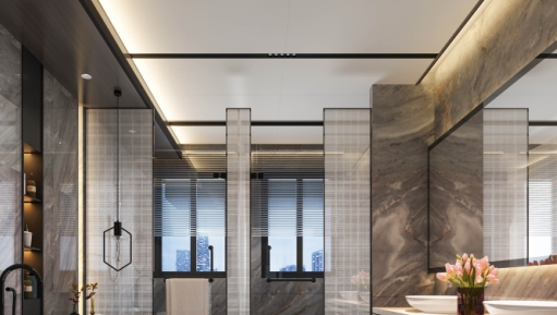 避免落入俗套,去繁為簡,用最簡單的配色,環保的蜂窩大板,讓浴室空間變得純凈,仿佛可以在這里洗滌心靈,貼近真我!